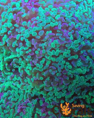 Bicolor Frogspawn has one of the most interesting structure among corals. It has neon green tentacles and violet colored polyps. It resembles a collection of frog eggs and hence the name frogspawn. Its interesting texture and color makes it must have.