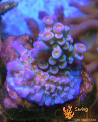 Walt Disney is a coral that is most sought after. It has a eccentric texture and color scheme. It has violet base, pinkish coralites and neon green polyps. It is truly a highlight of any coral collection