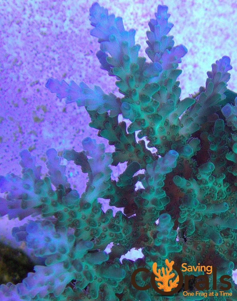 SC Frozen is coral that has a monochromatic spectrum of turquoise color. It’s darker turquoise green base and branches with greenish polyps come to a bone chilling ice blue tips and polyps. This is SC Dragons Breath archnemisis.
