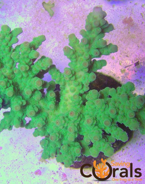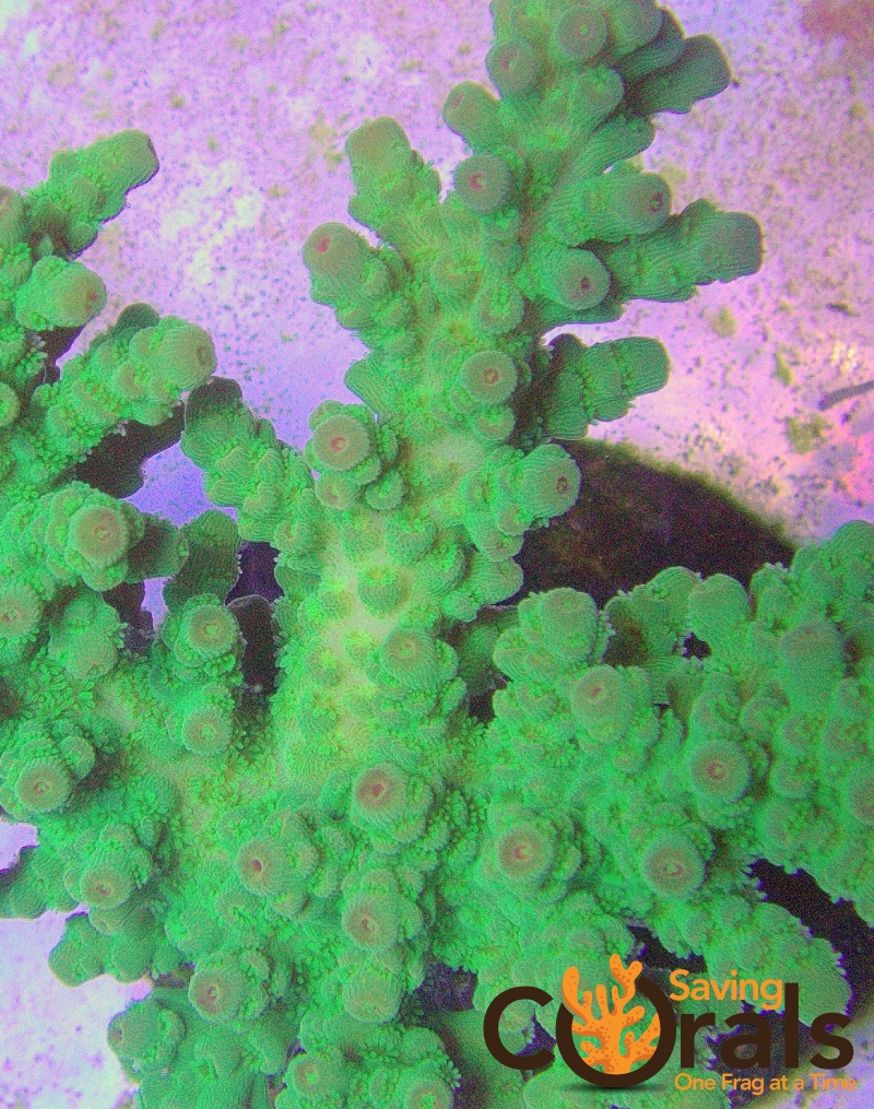 You can see the rosy cheeks on Kermits face with It’s pinkish-green base, pinkish coralites and neon green polyps.