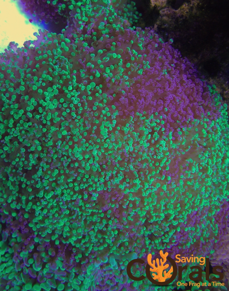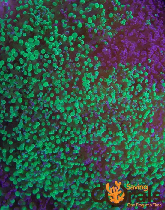 Splatter Paint Frogspawn is a large polyp stony coral with its characteristic of appearing like frog eggs. Splatter Paint has many violet and green tentacles and polyps. It has a delightfully contrast.
