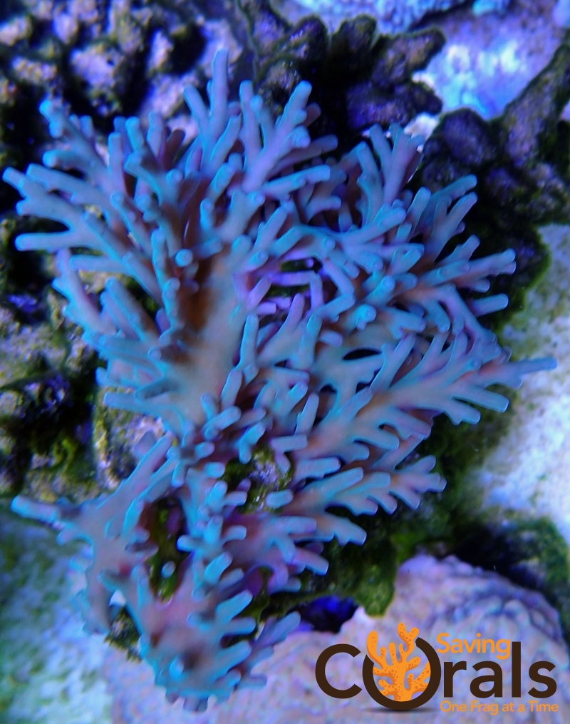 Teal Echinata has a pinkish-blue base with teal branches and neon blue polyps. It is a mesmerizing coral, a true eccentric coral.