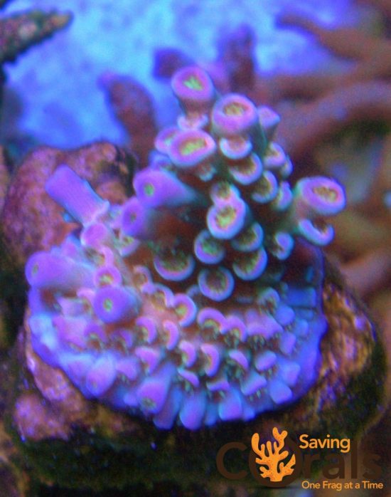 Walt Disney is a coral that is most sought after. It has a eccentric texture and color scheme. It has violet base, pinkish coralites and neon green polyps. It is truly a highlight of any coral collection